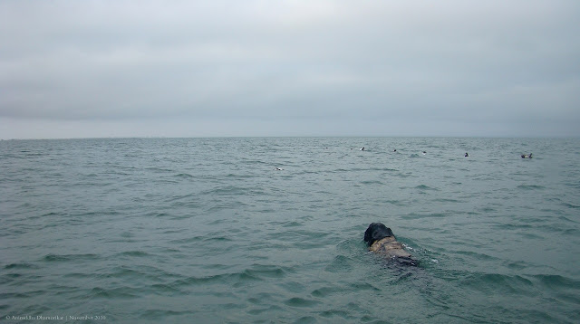 Dawn cleared the fog, but clouds prevailed throughout the day. The wind, although not ideal, was blowing from west, which just might push the ducks inside the bay where the ambush was laid. One hunter went on the layout boat and we sailed a little farther from the trap. Very soon we heard a gunshot. “He’s down”, we heard on the radio. I barely saw the bird going down, but the dogs were the first to see it. Eager to fetch, Oscar jumped into the water after his master signaled him to. I saw this duck for the first time, a Bufflehead. And it was dead. I am not yet familiar to seeing the first-ever species I come across so lifeless, but there it was. I held my camera for a while, wondering if I should photograph a dead bird I saw for the first time. I do support sustainable hunting, but I was reluctant to photograph it. The dead duck was sniffed by the dogs, and kept beside the master. Lance and Oscar are Labrador retrievers. They are bred to fetch. They are also considered to be most lovable, social dogs. The training to become retrievers begins early in life, where the dog has to learn to obey his master, then to fetch objects and bring them to the master instead of carrying it away, then to fetch decoys, to sniff the birds, and then to fetch an actual bird. A Labrador retriever is a quick learner, hence favorite amongst most hunters.