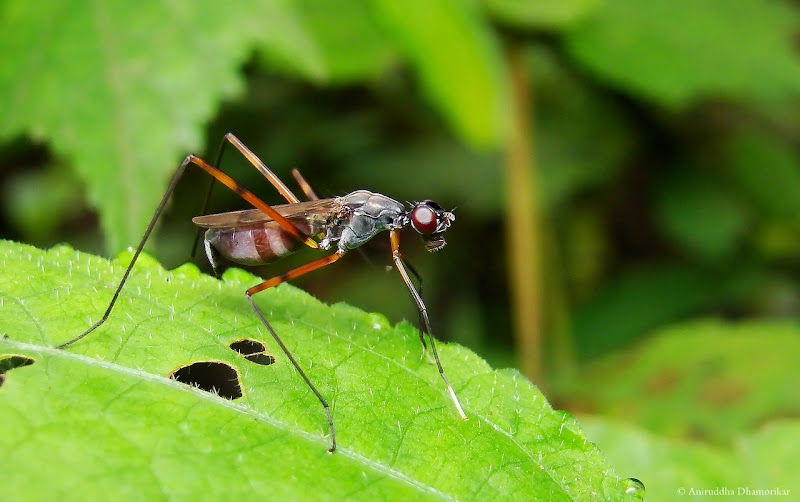 This dance is their own unique way of saying I’m here, watch out! and they’re well dressed to perform it – with their feet clad in white socks, and their red striped legs contrasting their silvery attire. This one was a female, and her abdomen is full of eggs which she will lay in the soil. Another fly was seen near a wide clearing with small shops.