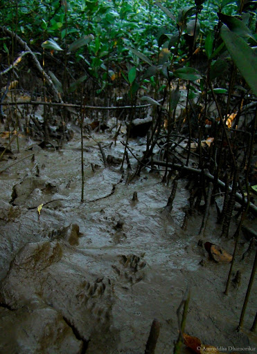 The mangrove forests are dense, dark, muddy, mysterious, eerie, and alien, amongst being beautiful. Stepping into these forests without the proper gear* is to lose one’s footwear (and one’s orientation) to the abyss of oxygen deprived, salt saturated nameless pit below. But there is a trick to get as closer to these trees as you can – the trick lies in following the footprints in the soft mud. And in these footprints lie the secret of the diversity of animals that survive here.