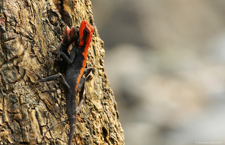 The Forest Calotes with their blood-red war markings are showcasing their prowess to females. A mating pair of a Calotes indeed resembles a clash between two red-painted warriors.