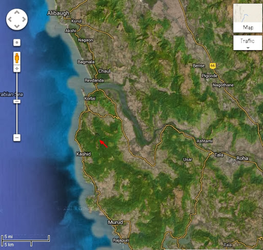 | Satellite image showing Phansad Wildlife Sanctuary marked by a red arrow and the closest towns around. It has a fairly good tree cover around, which could be conserved as wildlife corridors |
