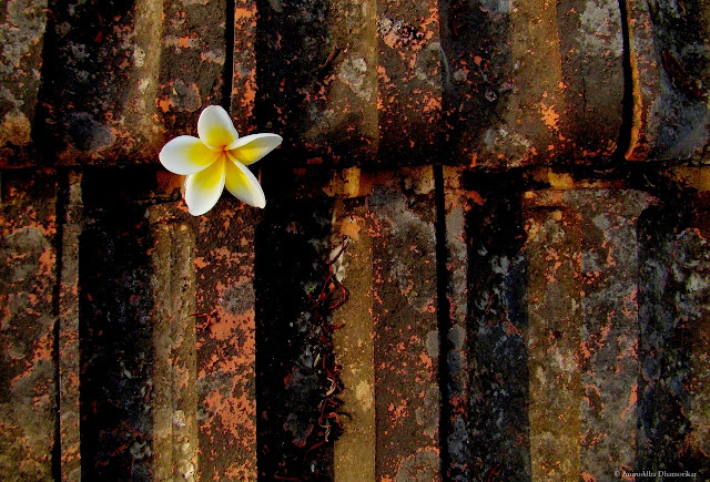 | A Plumeria flower at the Devrai (Sacred Grove) of Supegaon |
