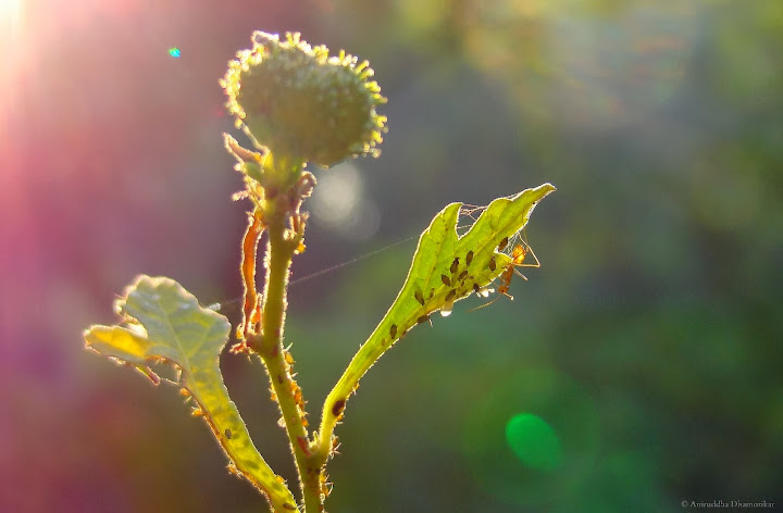 | On a clear winter morning, a Yellow Crazy Ant (Anoplolepis gracilipes) and aphids Nagla Block, Sanjay Gandhi National Park, 2012 |