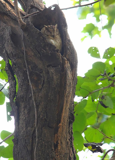 | The Collared Scops Owl (Otus lettia), rely more on camouflage than fleeing, and sit by their tree hollows during day-time |