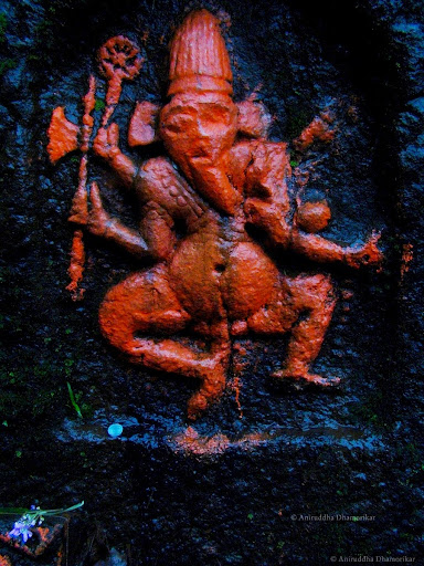 | A stone-carved idol of Lord Ganesha greets us on the way to Sindola Fort. I was surprised to see fresh flowers and a coin kept by the feet of the idol so early in the morning. |