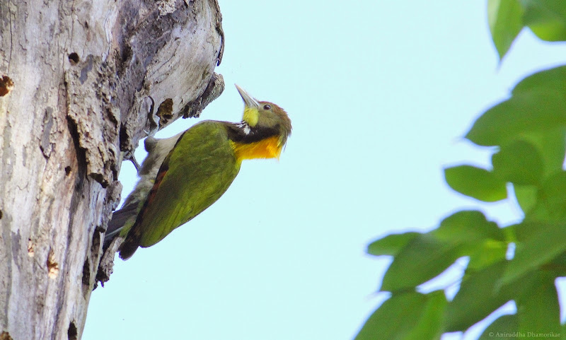A Greater Yellownape Woodpecker explores the stump of a dead tree for grubs