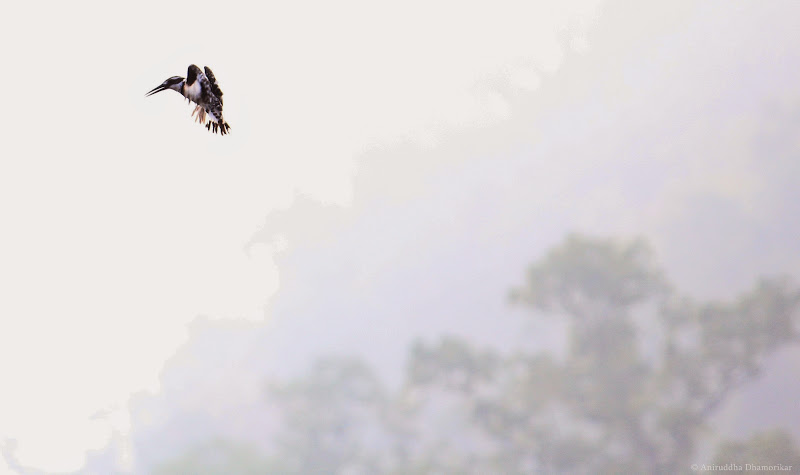 A Pied Kingfisher dances in the shadow of Garhwal Himalaya along Mandal River