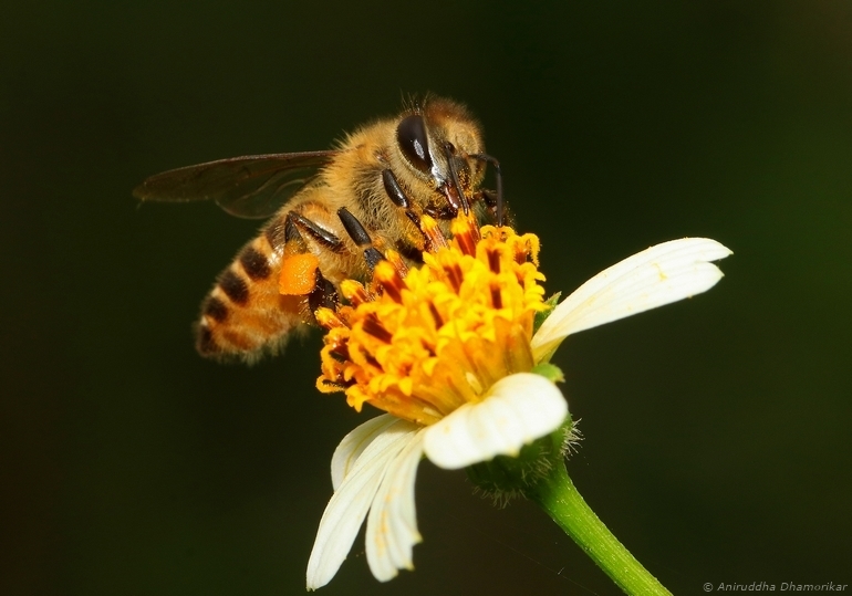 | The friendly neighbourhood Asian Honeybee, collecting pollen and nectar from Bidens pilosa. |