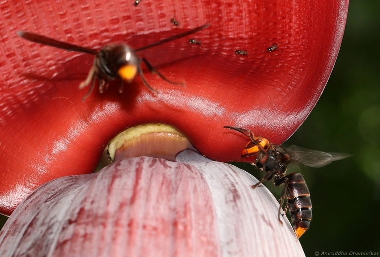| Two very restless Asian Giant Hornets lapping up the sap secreted by banana inflorescence. |