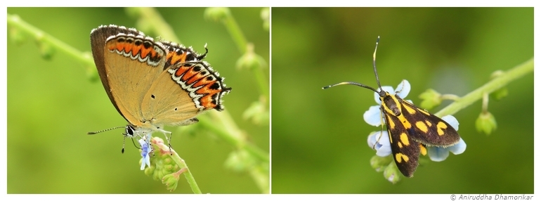 | Sorrel Sapphire and a forester moth, Artona hainana, visiting flowers of the native herb Cynoglossum. |