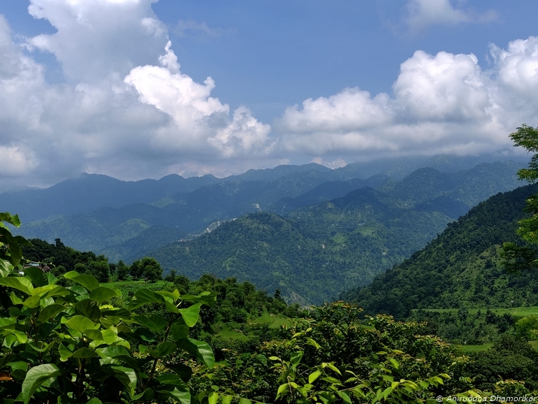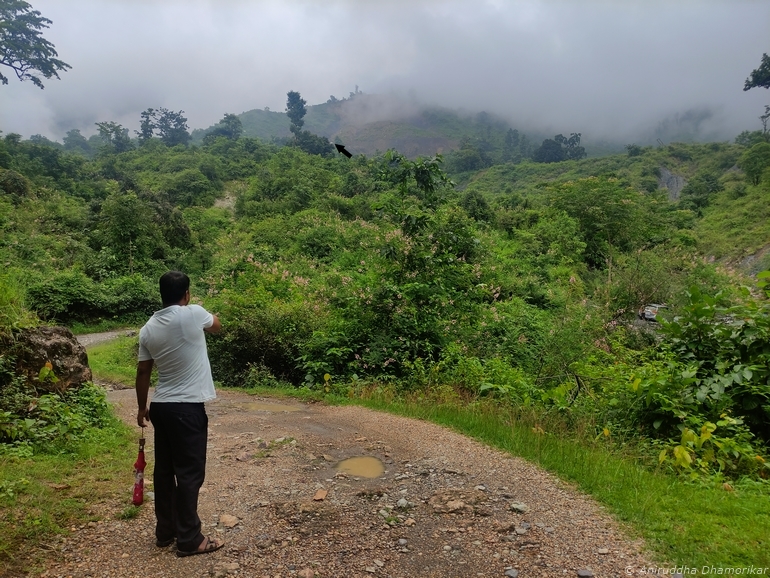 | The Bohrakot Trek: Mohan, my colleague, showing me where we trekked from as clouds roll in - indicated by black arrow pointing to the tiny speck that was a car stuck in the morning landslide. |