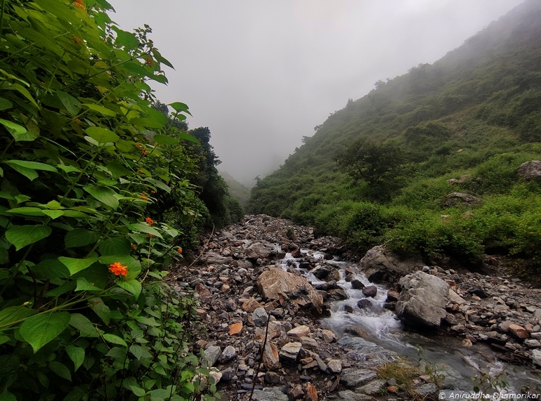 | The Shivalik hills dominated by Lantana camara, an invasive species, with a rain-fed stream gurgling down from the upper reaches. The M. himalayanus ant was found on the hill to the right. |