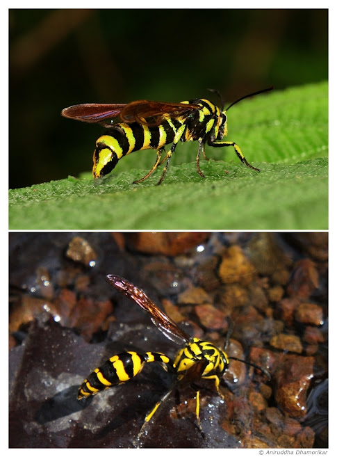 | The credible deception of Paranthrene chrysochloris (top), mimicking the black-and-yellow potter wasp Phimenes flavopictus (bottom; wasp photo not from Uttarakhand). |