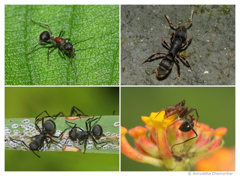 | Clockwise from top-left: The very cool Camponotus mutilarius, the giant Pseudoneoponera bispinosa, the lantana-visiting Myrmicaria brunnea, and the mealybug-attending Polyrhachis lacteipennis. |