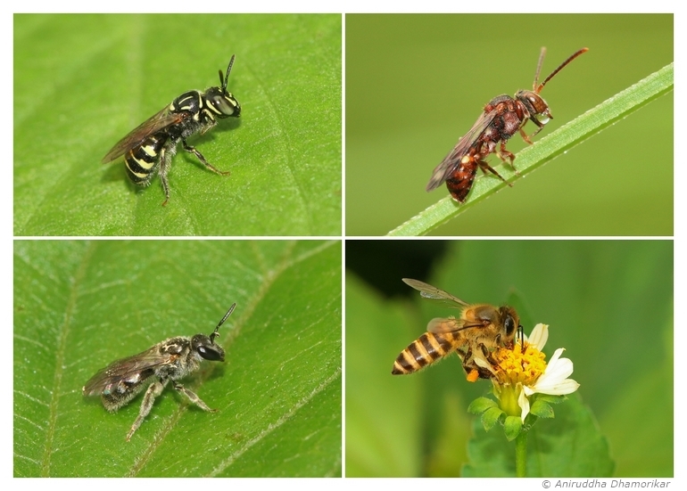 | Clockwise from top-left: Small Carpenter Bee Ceratina sp., Nomad bee Nomada sp., Asian Honeybee Apis cerana, and Sweat Bee Lasioglossum sp., all of them from the Van Panchayat areas. |
