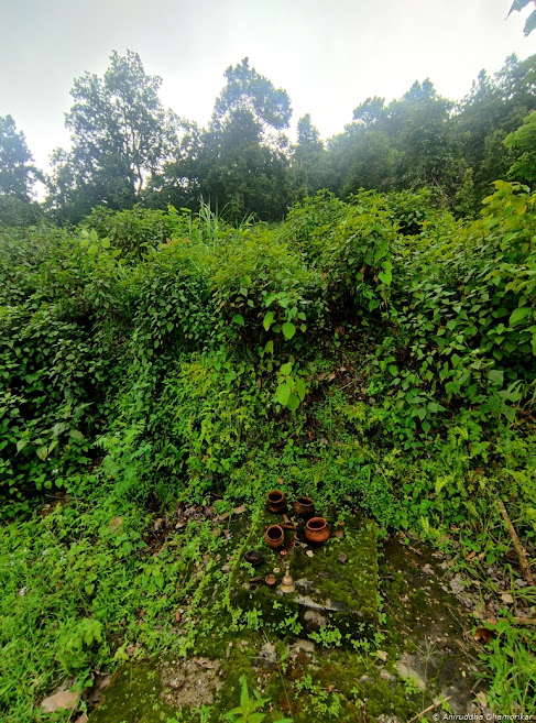 | A shrine for the village deity, comprising pots, chellum, and a bell, in the middle of a sacred grove. |