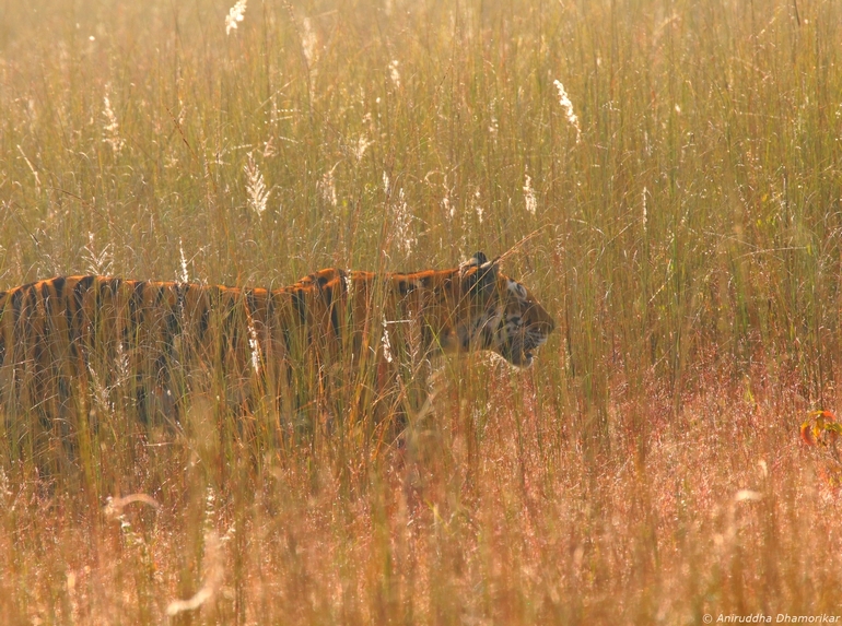 Her stripes dance as she walks past strands of grass. When she had had enough of us, she disappears into lantana-dominated undergrowth, the green curtain engulfing her whole. Our guide helped us with the direction she took as she walked on. Over the next half of the safari, we were informed of her making a chital kill, and then walking again towards the river to fetch her cubs for a meal. That night, they slept with a full stomach.