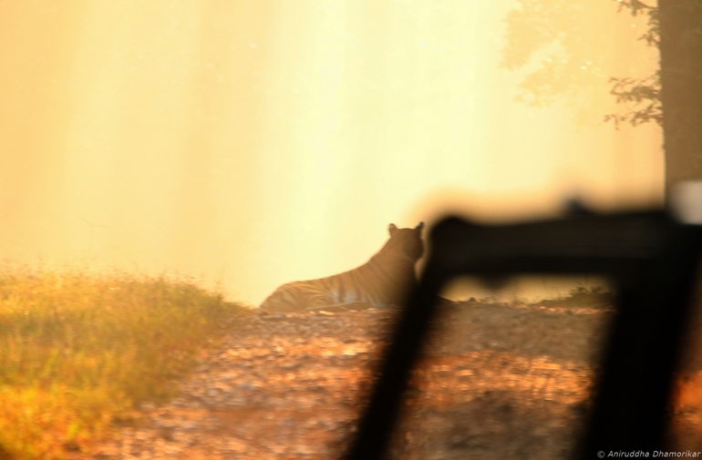 With temperature hovering between 10-15C, it was rather cold for my parents who came ready wearing thermals, winter caps, and gloves. Before the safari, I had asked them to not expect to see a tiger. I’m not sure if they sat back relaxed or disappointed as the jeep drove on. I am also not sure why we turned right while most vehicles turned left. As we lumber on before the sun breaks through the canopy, a large, round head stands out from the foliage twenty-yards to our left, like a glowing sun, within five minutes of our venturing in. It is T46, the dominant male of the area, also known as Bhaisanghat Male, scraping by the fire-line before proceeding to spray and disappear into the deep and dark woods. For such a large tiger, he is shy, we’re told, sticking into bushes if he sees humans huddled in their jeeps. In the very first instance, my disclaimer proved wrong even if the sighting did not last more than five minutes.