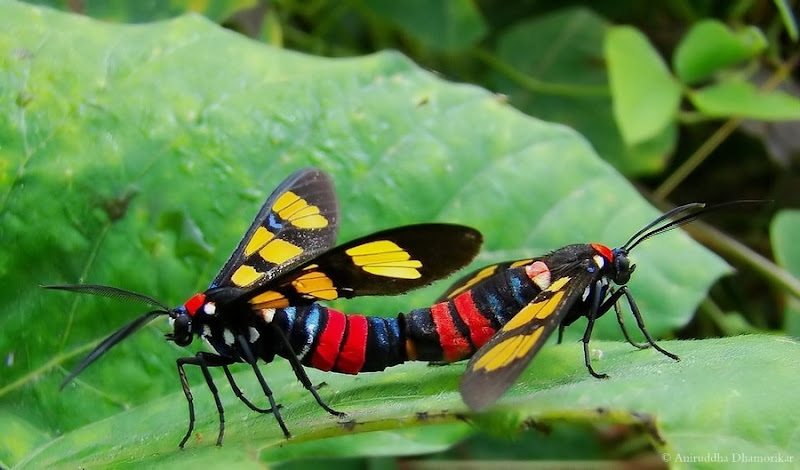 polymnea or elegantissima?), commonly called Handmaiden moth. I don’t know the reason for such a common name, but it has several other names – such as day-flying moth because they’re out and about throughout the day, or Wasp moth – because of their superficial likeness to a wasp, something observed in many species in the family Arctiidae. There were many individual moths feeding on flowers alongside butterflies, as well as some mating in large numbers. It is a common moth of SGNP, along with several of its cousins (