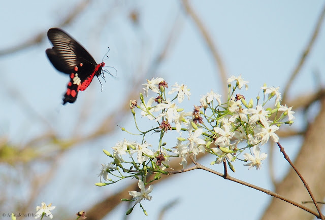 There were many trees flowering too, among which the brilliant white blossoms of Wrightea, attracted many insects including this dark Common Rose that stood out strikingly well against a bright background. Among trees, the blossoms of Paveta sp. and Pongamia pinnata were also a sight for sore eyes.