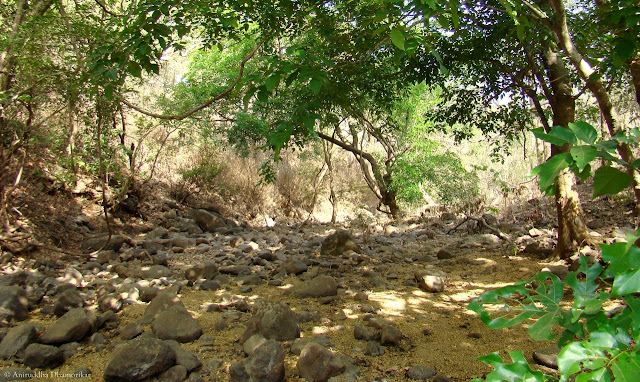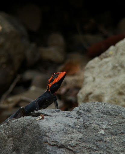 Our aim was also to find snakes, but the high temperatures might have kept them hidden from out sight. Nevertheless, we observed many lizards, specifically Calotes – two of them fighting over something, either a female or a territory, and one brightly coloured male Calotes rouxii flaunting himself from the tallest peak – a large boulder – in his territory.