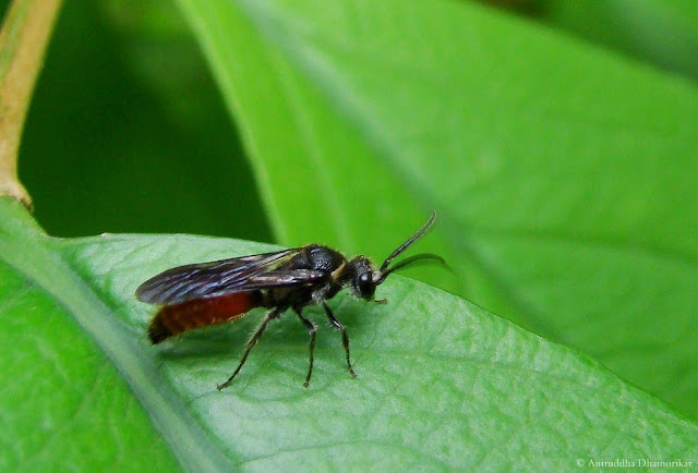 This is (most likely) a male Velvet Ant in the family Mutillidae. Velvet Ants are indeed seen in SGNP, but they are so inconspicuous in their preferred habitat, which is mostly the forest floor, that it becomes difficult to come across one. The females, for which this common name is suitable, are parasitic, some lay eggs on Tiger Beetle grubs and some in other wasp nests. They are also really small. This male was barely a centimeter in length, and the female must be hardly half a centimeter across! I happened upon this fellow as he was resting on a leaf. It was windy and dark enough to ruin any possibility of a good picture, but I’m glad to have come across it.
