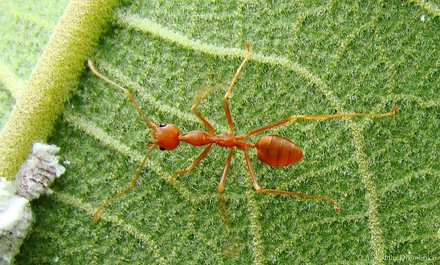 I happened to spot an ant, or so it seemed, on a large Teak leaf, walking to and fro from one end to the other. At closer inspection, I was excited to find that this was a fly that mimicked an ant, particularly the Weaver Ant, extraordinarily. It matched the walking so perfectly that I didn’t realize it until I was only a foot from it. In fact, when I saw the real Weaver Ant further down the trail, I had to look carefully to make sure if it was the fly again!