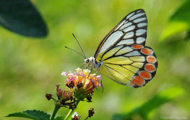Amongst Lepidoptera, the Nymphalids were, as always, the most common, followed closely by Hesperids and Lycaenids. This Common Jezebel was photographed as it quickly sipped nectar from the exotic Lantana camara inflorescence. It wasted no time on one flower, and never really did settle in one place. There were others around as well, such as a Common Nawab that flew past us, a Tailed Jay, Common Wanderer, Common Four-ring, a female Common Palmfly and a few others.