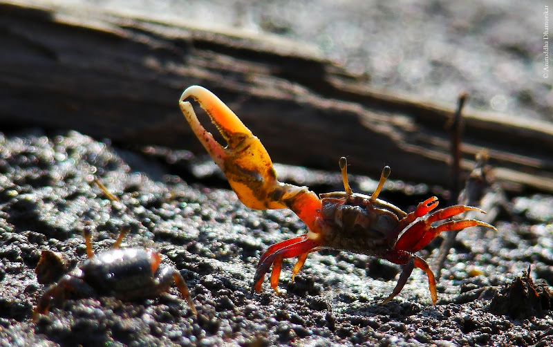 With his heavyweight arm raised high in the air, he raised his other tiny half – in addition to two feet – so that he doesn’t topple over to one side. Our victor showed off his superiority. It was a great moment to see all the males raise their chelicerae in air and drop them again, as if waving to a passing by female (the behaviour a way of saying “mate me, mate me!”). It is also a reason why they are called Fiddler Crabs, which I think is a misnomer. They don’t fiddle with their strong arms, they’re too confident to do that. The notion that it is a crab playing a violin also does not agree with me.