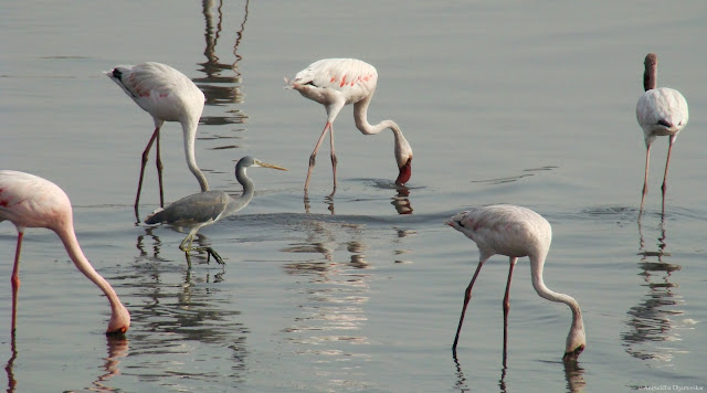 A determined Reef Egret stalks the water carefully amidst the feeding Flamingos. She carefully wades amongst them, focusing on the little fishes and shrimps that may stir amongst so many feet and expose their presence. Common Sandpipers, Curlews, Black-winged Stilts, Bar-tailed Godwits, and many more feed in these waters. And all these birds, the apex predators of this ecosystem – target an array of lifeforms, from those microscopic (like blue-green algae, the specialty of the Lesser Flamingos) and the large crabs and fishes (the specialty of egrets, herons and terns).