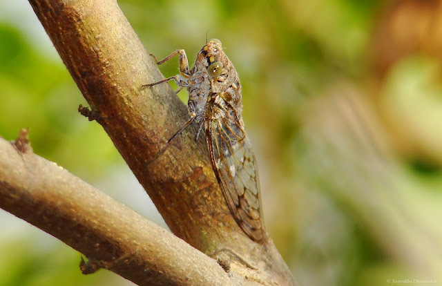 These fellows are hard to identify based on photographs. Besides complex morphology and similarities between many species, the summer cicadas can however be distinguished from the monsoon cicadas because of their size. The summer ones are quite large, while the monsoon ones are small and more colourful. I think it has to do with camouflaging for protection. During summer, these cicadas have very few places to hide – few trees are evergreen throughout the summer, and not many cicadas rely on such for food. Therefore, cryptic colouration is their best chance to avoid being eaten. On the other hand, the monsoon cicadas have plenty of places to hide, and therefore, can afford to have brighter colours. I find it rather similar to the evolution of birds of the rainforests, which have plenty of places to hide and therefore afford brilliant colouration, and those of the arid regions, which are drab, mainly to rely on camouflage.