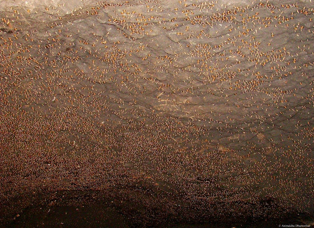 These flies, probably muscoids, had overtaken the cave where we lunched in monsoon. They were all born at a perennial stream that dripped near the age-old stone steps running parallel to the caves. This behaviour is rather intriguing as much as it is exhilarating; because it is the first time I’ve seen swarming flies – with red eyes. What’s more interesting is that amidst this swarm sat Acherontia styx, commonly called Death’s Head Hawkmoth. Talk about one’s nightmares!