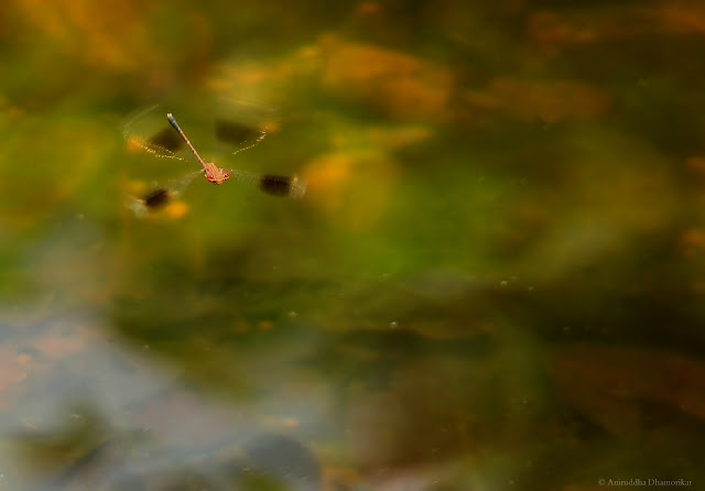 In June, starting from late May, Trithemis aurora females are common along forest-clearings. As the monsoon begins, the males capture territories along the waters – mostly free-flowing streams, where they defend it from a number of other larger Dragonflies, as well as small but persistent Damselflies. Yet they never always succeed in claiming their territory, and several species end up laying eggs in the same spot.