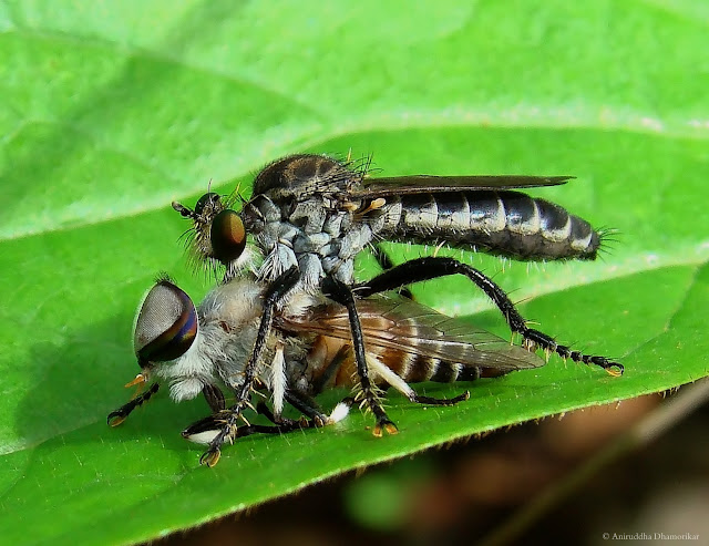 These flies are ferocious predators, but are splendid lovers and responsible mothers. Sure, it is all coded in their genes like ours, but in case of insects, nature takes its course in the most efficient manner. Nurture, on the other hand, is their own responsibility. The Robberflies will reign throughout the Monsoon, some well into the dry months. And as the season grows old, their competition will only increase.