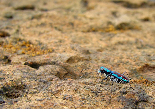 In case of Tiger Beetles, it is not worth making a checklist, simply because there exists none for Sahyadri (which is a shame really), but also because they are some of the most ephemeral and elusive of all insects. For instance, I explored as much for these beetles last year as this, and I could identify only 5. This year was a bonus, with 9 to 10 species on the list: some as inconspicuous and small as a fleck of dust in a dust-storm, some as brilliantly obvious as Nyctanthes arbor-tristis on a dark night.