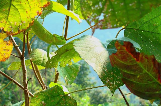 It took me more than a few second to make out the shape of the creature I had always wished to see. An arched back, a serrated underside, bejeweled eyes, and studded emerald scales slowly stood out of the uniform greens around. A mouth, opening and closing, chewing onto something, further cleared my doubt. What’s amusing is that finding a Chameleon wasn’t even in the remotest corners of my mind on that morning. From then on it was only I and the Chameleon exploring one another.