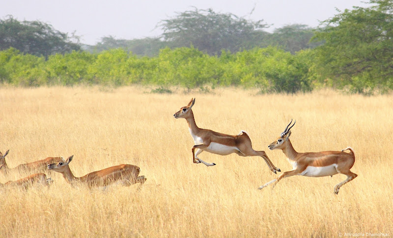 The female and a sub-adult blackbuck pronging through the grasslands of Velavadar, with no one to chase them |