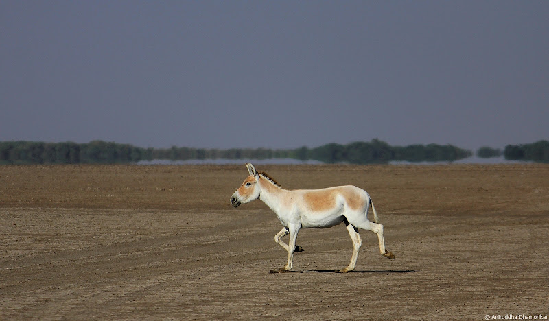 The Indian Wild Ass, an endemic Equus subspecies, feeds on the desert grass of the Little Rann of Kutch as Prosopis, in the background, slowly reclaim the deserts |